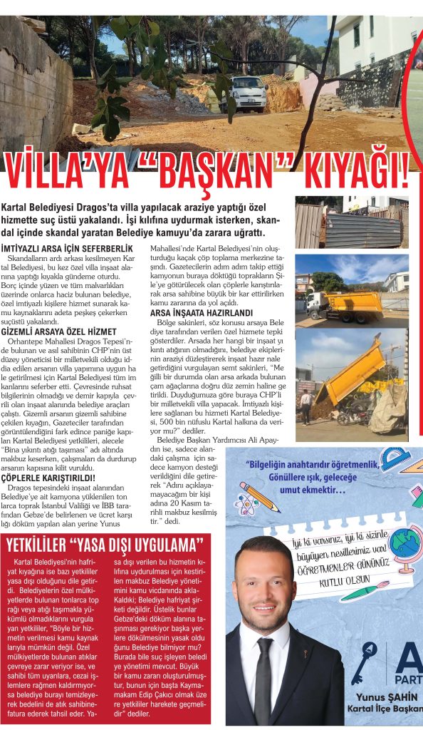 CHP’li Kartal Belediyesi’nin, geçtiğimiz hafta Orhantepe Mahallesi Dragos Tepesi’nde CHP’nin üst düzey yöneticisi bir milletvekiline ait olduğu öne sürülen özel villa arazisinde hafriyat çalışması yaptığı ortaya çıkmıştı. “Yasa dışı” şekilde gerçekleştirilen bu hafriyatın, belediye ekiplerince Yunus Mahallesi’nde kurulan “kaçak” çöp toplama istasyonuna taşındığı, burada çöplerle karıştırıldıktan sonra da Gebze’ye gönderilmesi gerekirken Şile’ye nakledildiği belirlenmişti. Böylece milyonlarca liralık hafriyat vurgunu ve kamu zararı iddiaları gündeme geldi.